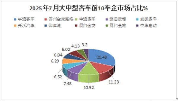 上图表可见,在2025年7月6米以上客车销量、同环比及市场占比中,TOP10客车企业呈现以下特点:
