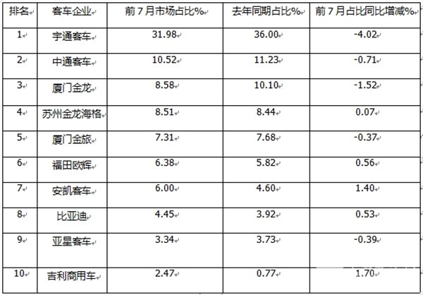 总之,今年1-7月前10车企市场占比同比5增5降,其中吉利商用车占比同比增加最多(增加1.70个百分点);宇通客车占比同比减少最多(-4.2个百分点)。
