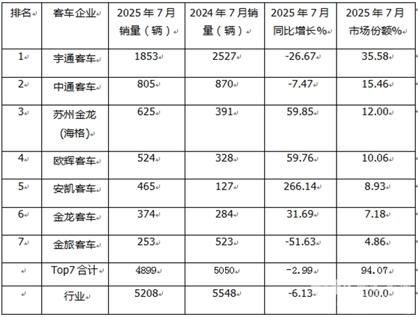 表1,根据中国客车统计信息网数据,2025年7月6米以上传统动力大中型客车销量top7排行(只统计销量在200辆以上车企)