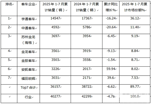 总之,2025年1-7月Top7累计销售36157辆,累计同比下降6.62%,跑累计占比近9成,可见大中型传统动力客车市场集中度较高。