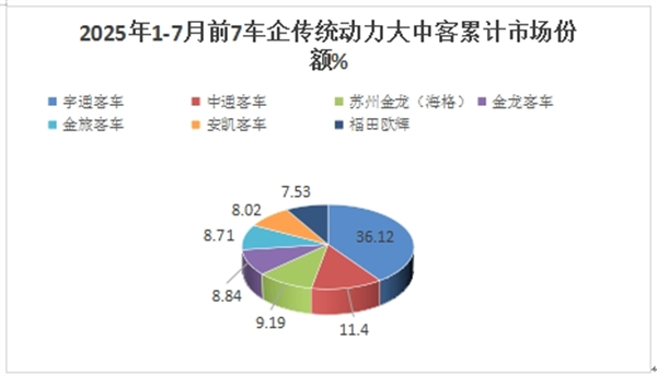 上表可见,2025年1-7月大中型传统动力客车销量同比增长-4.78%,跑输2025年1-7月大中客大盘7.88%的增速近12.66个百分点。说明2025年1-7月大中型传统动力的客车市场成为遏制今年1-7月大中型客车市场大盘增长的主要力量。
