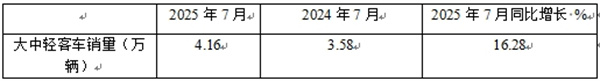 表1、2025年7月大中轻客车同比增长22.64%(数据来源:商用车专业委员会提供的批发信息):