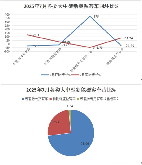 表1:根据中国客车统计信息网数据,2025年7月我国7米以上新能源客车各细分市场销量及同环比比较、市场占比: