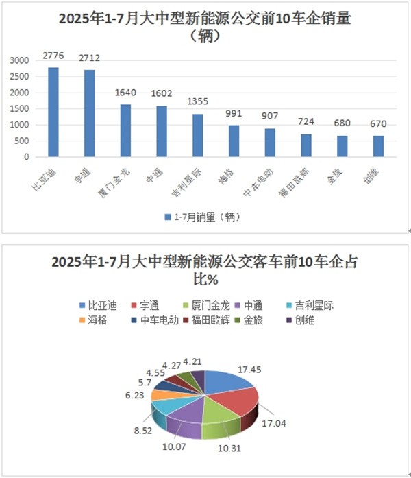 根据中国客车统计信息数据,2025年1-7月新能源公交客车销量top10及市场份额: