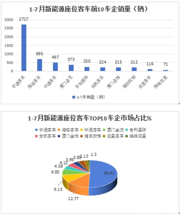 上图表显示,在2025年前7月我国大中型新能源座位客车前10车企累计销量中: