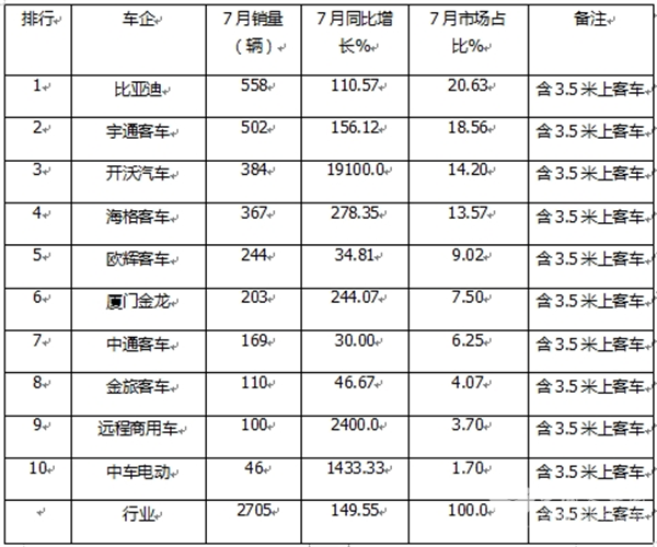 一、7月公交客车出口排行:比亚迪夺冠,宇通\开沃分列二三;前10车企同比均增长,其中同比开沃领涨