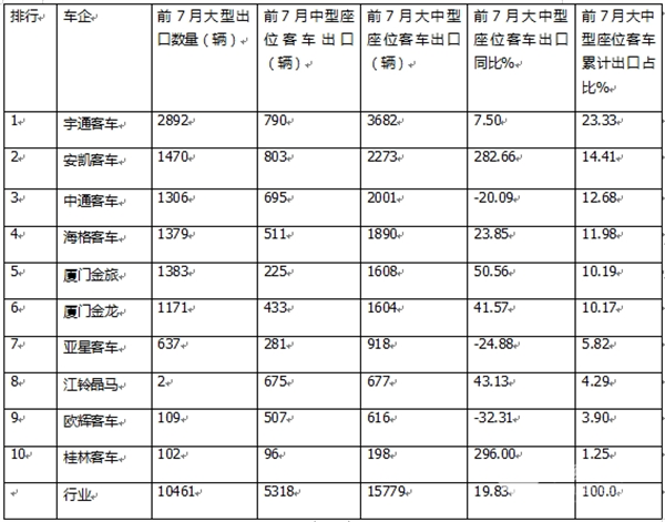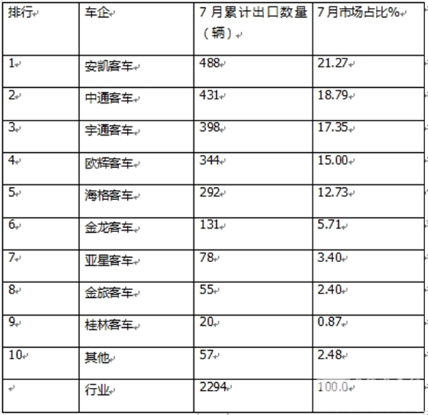 三、7月大中型座位客车出口:安凯跃升第一,中通\宇通分列二三