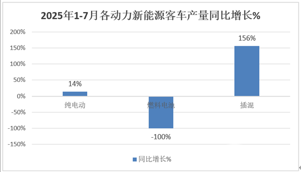 从今年前7月累计同比增速看,纯电动客车产量累计同比增长14%,插电式混动客车累计产量同比增长156%,燃料电池客车累计产量同比下降100%。