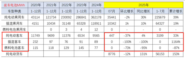值得关注的是, 2025年7月我国新能源客车动力电池装机量为447MWh(将截图3中2025年7月份的纯电动客车装车量447MWh+2025年7月的插电式混动客车装车量0MWh+2025年7月的燃料电池客车的装车量0MWh) ,同比增长大约4%;2025年前7月新能源动力电池累计装机量大约为3199MWh,同比增长近40%。