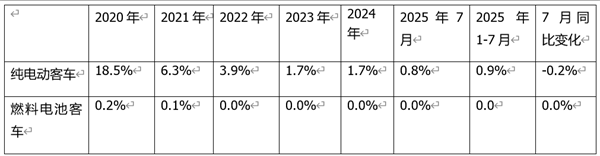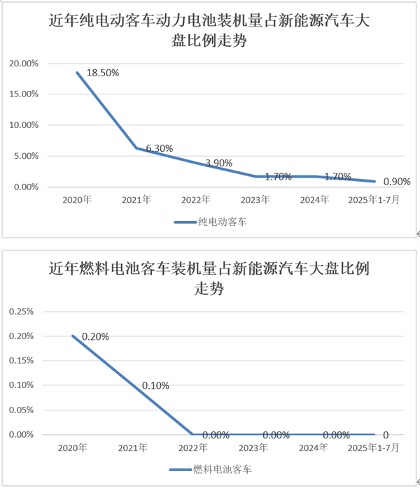 ---燃料电池客车动力电池装机量占据新能源汽车大盘的比例很少,从2020年的0.2%占比下降到2021年的0.1%占比,然后从2022年到2025年前7月占比均为零;其中7月占比为0%,占比同比也为0%。