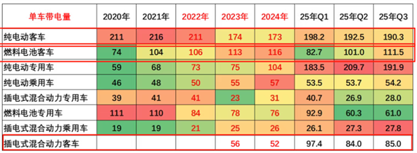 六、各类技术路线新能源客车单车平均带电量简析