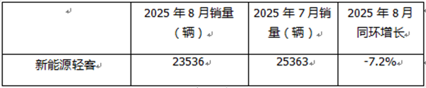 根据终端上牌数据,2025年8月国内轻客实销3.67万辆,同比小降0.8%。