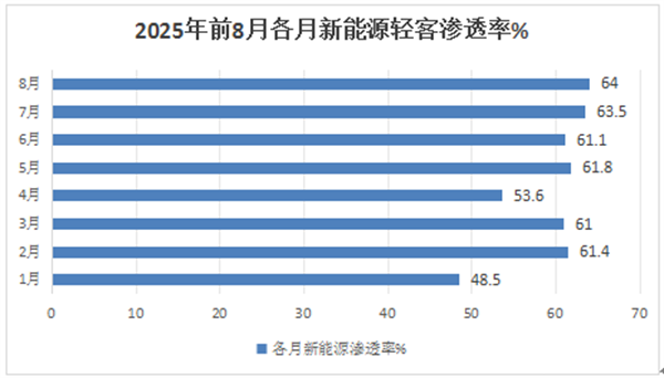 根据终端上牌信息可知,2025年8月国内新能源轻客销售2.35万辆,占据国内轻客大盘销量3.67万辆64.0%的比例,创2025年1-8月各月最高。