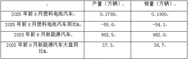 截图1,2025年8月燃料电池汽车及新能源汽车产销同比(数据来源:中汽协)