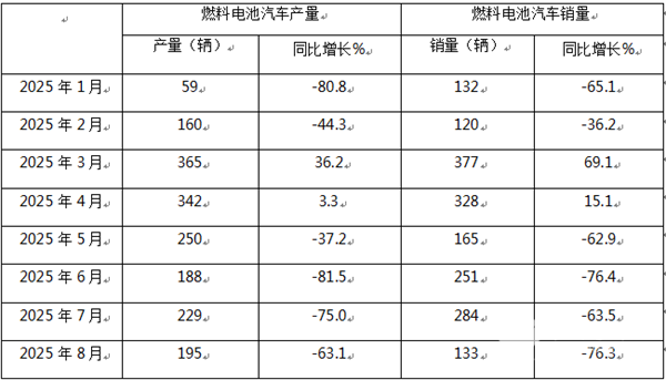 表1,根据中汽协数据,2025年8月燃料电池汽车产量同比统计: