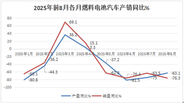 从上图表可见,从2025年1月--2025年8月我国燃料电池汽车产销同比依次演绎了“2连降”和“2连涨”和“4连降”。