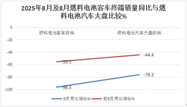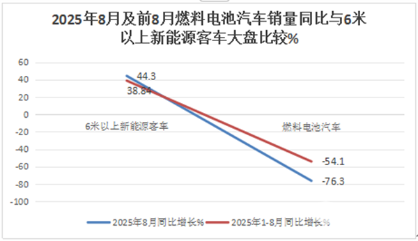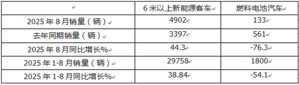 总之,2025年8月及1-8月燃料电池汽车销量同比增速均跑输大中型新能源客车大盘。