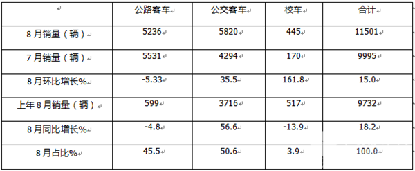 据分析主要原因除上文已经提及的以外:还有就是去年同期旅游公路客车销量基数较高,给今年同期增长带来压力;另外就是前8月大中型新能源公路市场表现有些“不温不火”,没能给公路客车整体市场提供支持作用。