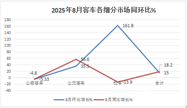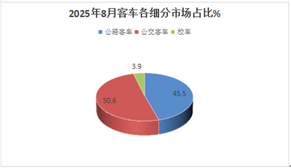 上图表可见,在2025年8月5米以上公路、公交、校车三大细分市场中: