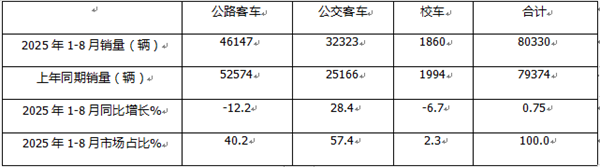2025年1-8月5米以上客车累计销售80330辆,同比去年同期的79374辆增长0.75%;