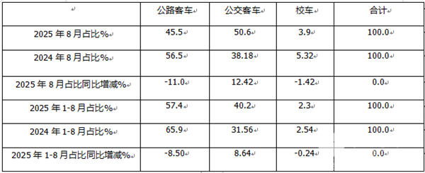 可见,无论是2025年8月还是1-8月,公交客车同比均领涨;而在2025年8月环比中,校车领涨;从市场占比看,今年8月校车领跑;1-8月公路客车领涨。