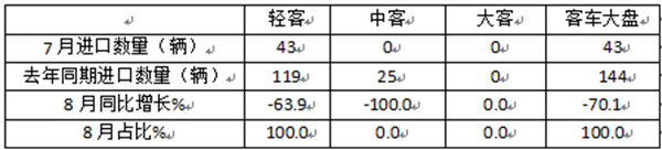 ---轻客进口43辆,同比增长-63.9%;市场占比100%,可见今年8月客车进口“清一色”为轻客;据分析全部是进口欧系的柴油轻客较多,主要体现了对欧轻客市场的高度认可;