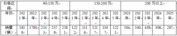 通过上表可以看出:通过价格来细分高档客车市场,把豪华客车的价格分成三个区间,即90—150万,150—200万,200万以上。这样分析起来就比较方便和清楚一些。