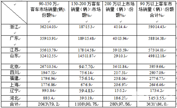 1、浙江、广东、江苏等10个区域市场是90万以上高档客车市场的主要需求市场,集中度比较高。需求比例占整个高档客车市场的84%。