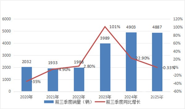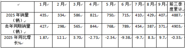 2025年前三季度累计销售国六燃气客车4887辆,比去年同期累计销售的4903辆微降0.33%;