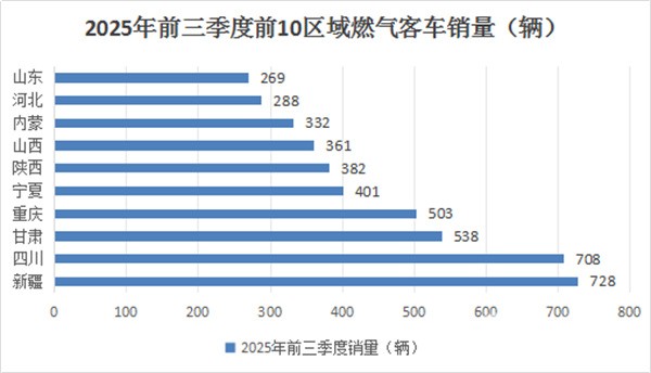 根据终端上牌信息显示,2025年前三季度国六天然气客车全国区域销量流向不均衡,主要销往新疆、四川、甘肃、重庆、宁夏、陕西等气源比较丰富、且加气站网点比较密的区域。