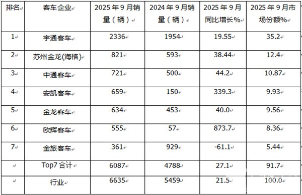 表1,根据中国客车统计信息网数据,2025年9月6米以上传统动力客车销量top7排行(只统计销量在350辆以上主流车企)