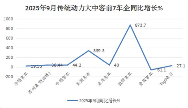 上图表可见,在2025年9月6米以上传统动力客车销量及同比中,TOP9客车企业呈现以下特点: