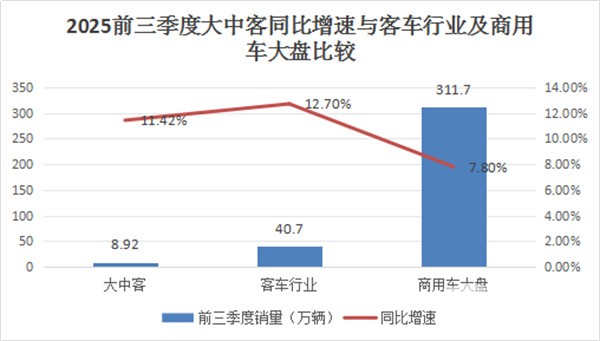 据中国客车统计信息网及中汽协数据,2025年前三季度我国大中客车同比增速与客车行业及商用车大盘比较: