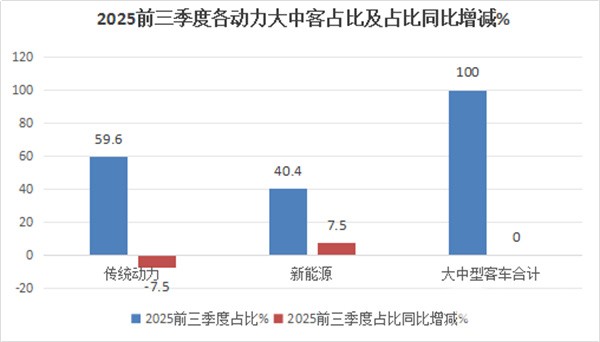 ---从占比及占比同比增减看,2025年前三季度大中型新能能源客车占住大中客行业40.4%的份额,处于从属地位,但占比同比出现较大幅度的增加(同比增加7.5个百分点);而大中型传统动力客车占大中型客车行业59.6%的比例,居于主体地位,但占比同比减少了7.5个百分点。