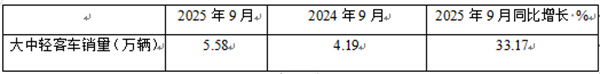 表1、2025年9月大中轻客车同比增长33.17%(数据来源:商用车专业委员会提供的批发信息):