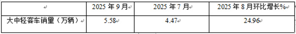 ---2025年9月我国大中轻客车环比增长24.96%,主要是因为今年9月市场景气度好于8月(国家统计局数据显示,2025年9月我国制造业PMI指数为49.8%,环比提升0.4个百分点),经济大环境更利好大中轻客车需求;加之8月销量基数不是太高,给今年9月环比增长提供了机会。