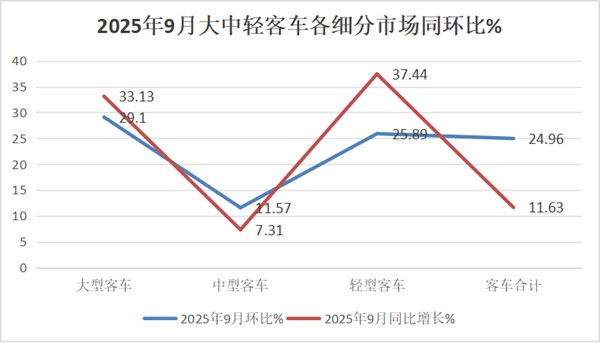从2025年9月大中轻客车环比看,大中轻客车环比分别增长29.1%、11.57%和25.89%。可见今年9月大中轻客车各细分市场环比也均增长,其中大客环比增幅最高领涨。