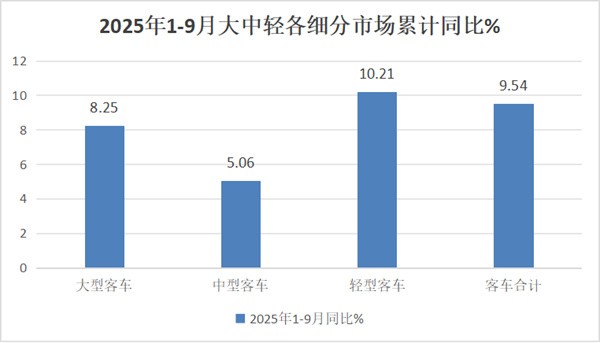 2025年1-9月大中轻客车增速均较低,说明2025年1-9月我国大中轻客车各细分市场,主要是当前经济大环境不是太“给力”,各行业对大中轻客车的需求动力仍然显得不是很强劲。