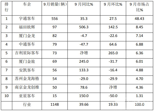 9月新能源座位客车:销1148辆!同环比“双增” 欧辉\金龙分列二三
