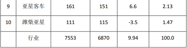 ---前10车企累计同比4增6降,吉利星际客车以972%的增速领涨。