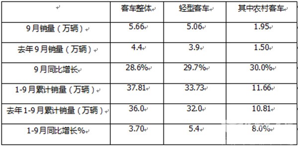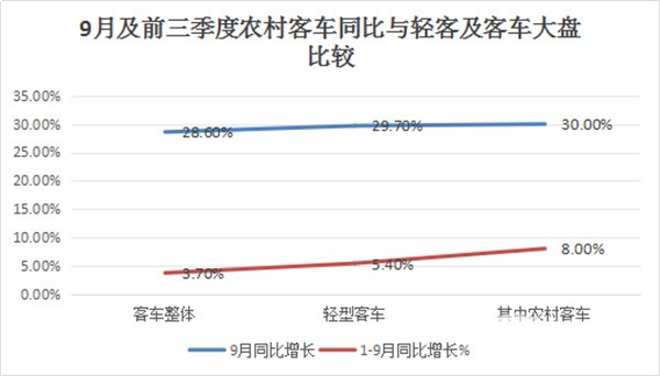 总之,不论今年9月还是前三季度,农村客车市场同比增长均领涨国内客车大盘及轻客整体市,成为推动国内客车市场增长的骨干力量。