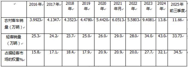表2,根据终端上牌,2016年---2025年近10年各年农村客车销量及占据轻客市场的比例统计如下: