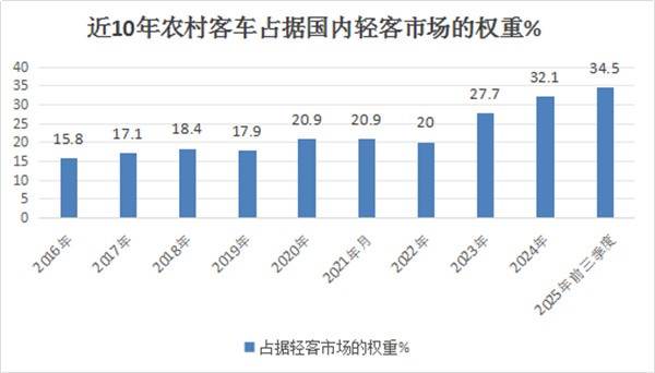 上图表可见,在2025年前三季度,我国农村客车占据轻客市场的比例为34.5%,创近10年以来新高。这也是今年前三季度我国农村客车市场一个主要特点,主要得益于国家支持农村客货邮融合发展政策的大力推动及各类新产品的支持和保障。