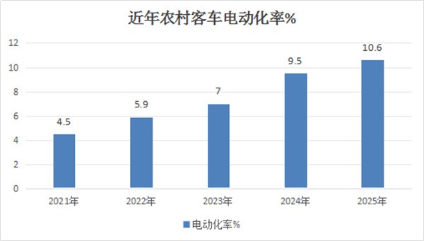 根据终端上牌数据,近5年农村客车电动化率统计如下: