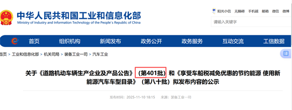 2025年11月10日,工信部发布关于《道路机动车辆生产企业及产品公告》(第401批公告,下也称”本批次公告”),这是2025年以来工信部发布的第11个批次的新车产品公告,也是2025年下半年的第5批公告。