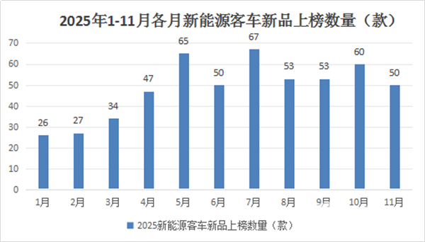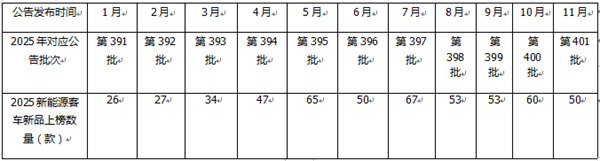 上图表显示,2025年11月工信部发布的第401批公告中,上榜新能源客车新品50款,居今年以来各月第五(与6月份并列第五),处于中等水平,相对上月的申报数量有所减缓,这主要是因为2025年新能源公交老旧新能源公交淘汰更新补贴政策到年底就结束了,而11月份已接近年底,之前申报的新能源客车新品比较多,为了节省企业的资源,因此到年底车企申报的数量逐渐趋缓。