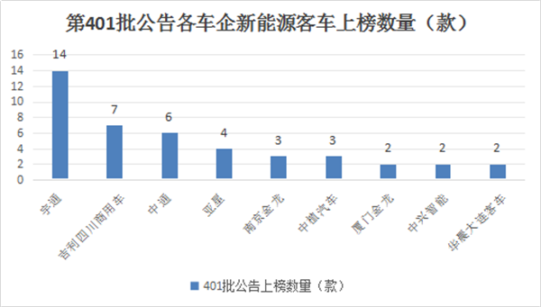 在第401批公告中有19个客车品牌企业参与了新能源客车新品申报,各个品牌上榜数量统计如下:上榜数量在2款及以上的车企品牌统计如下: