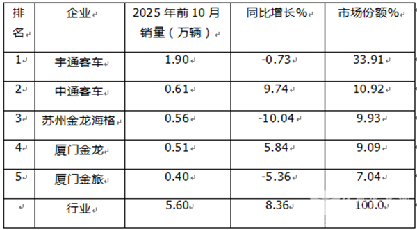 根据中汽协数据,2025年前10月大型客车(含底盘)累计销售5.60万辆,同比增长8.36%,TOP5企业2025年前10月大型客车销量、同比、份额统计: