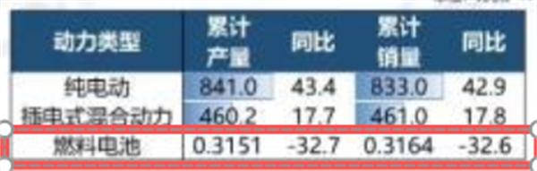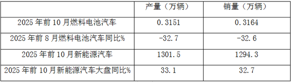 上表可见,2025年前10月燃料电池汽车产销分别为0.3151万辆和0.3164万辆,同比分别下降32.7%和32.6%,产销量同比均远远跑输2025年前10月新能源汽车产销大盘。