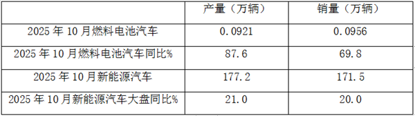 截图1,2025年10月燃料电池汽车及各类新能源汽车产销同比(数据来源:中汽协)